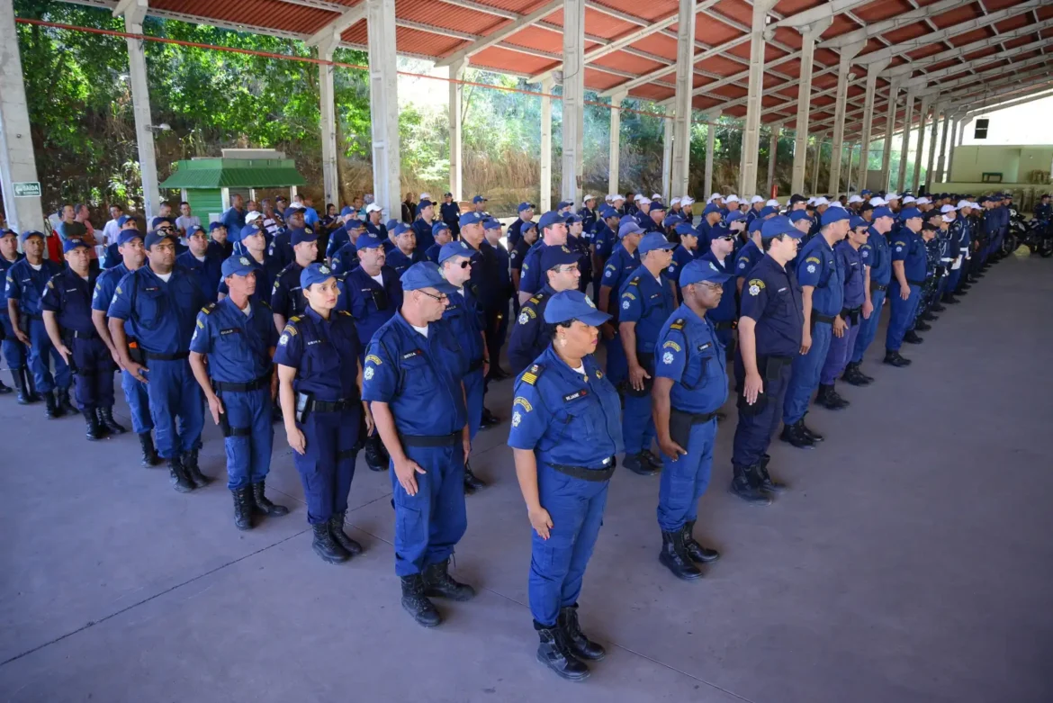 Guarda Municipal em cerimônia de alinhamento com foco nos profissionais alinhados e atentos