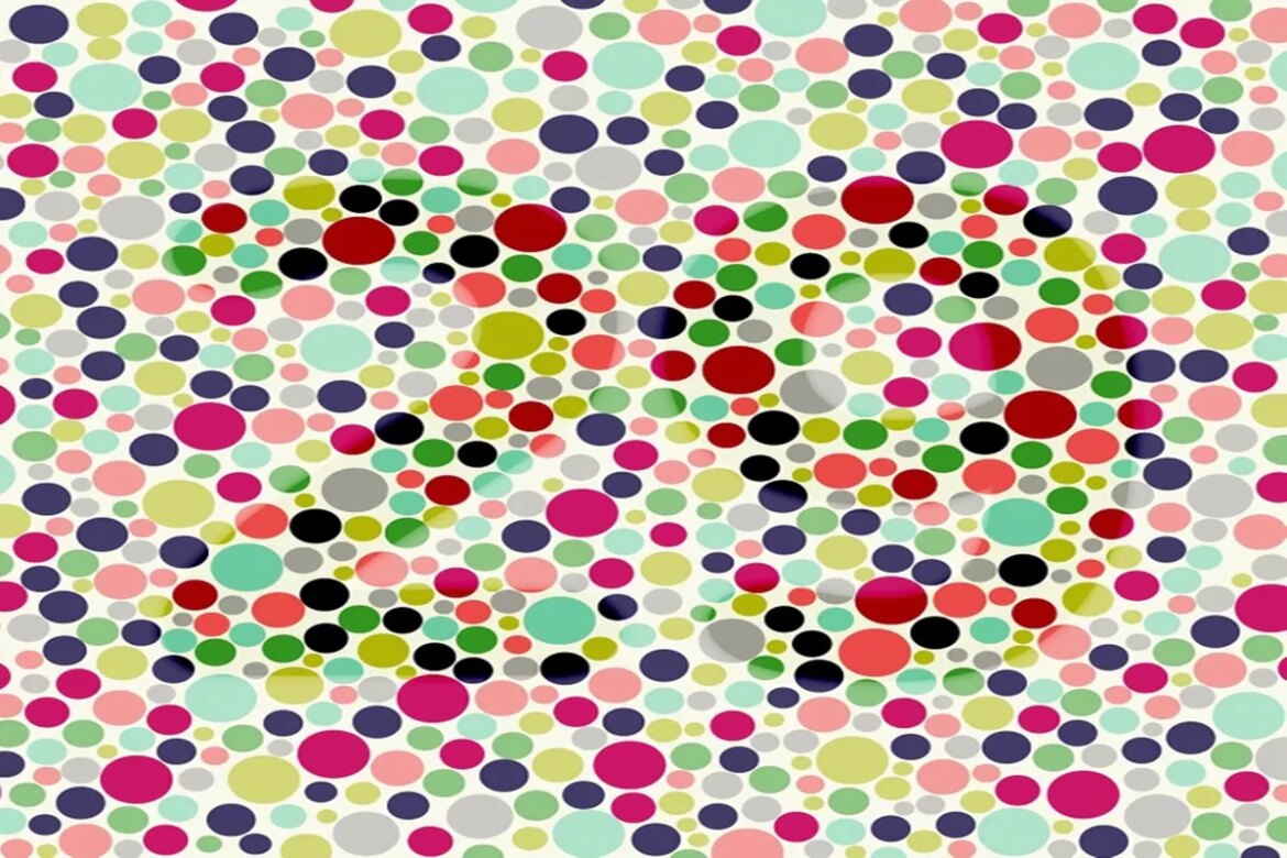 Prepare-se para o desafio de hoje que vai testar sua percepção! Observe com bastante atenção a imagem com uma placa de Ishihara composta por diversos círculos coloridos sobre um fundo branco, com o número camuflado destacado no centro.