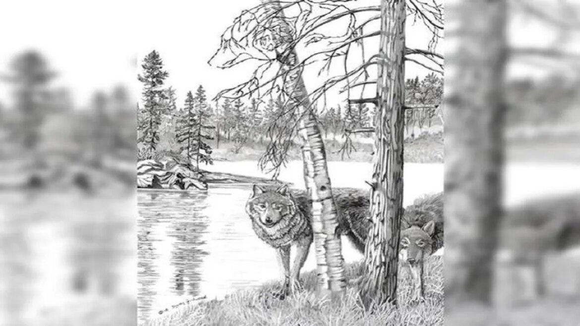 Prepare-se para um desafio que vai testar sua percepção! Observe com bastante atenção a imagem de um desenho em preto e branco de lobos próximo de uma árvore. Existem um lobo camuflado nesta imagem. Você consegue encontrar os lobos escondidos em até trinta segundos?