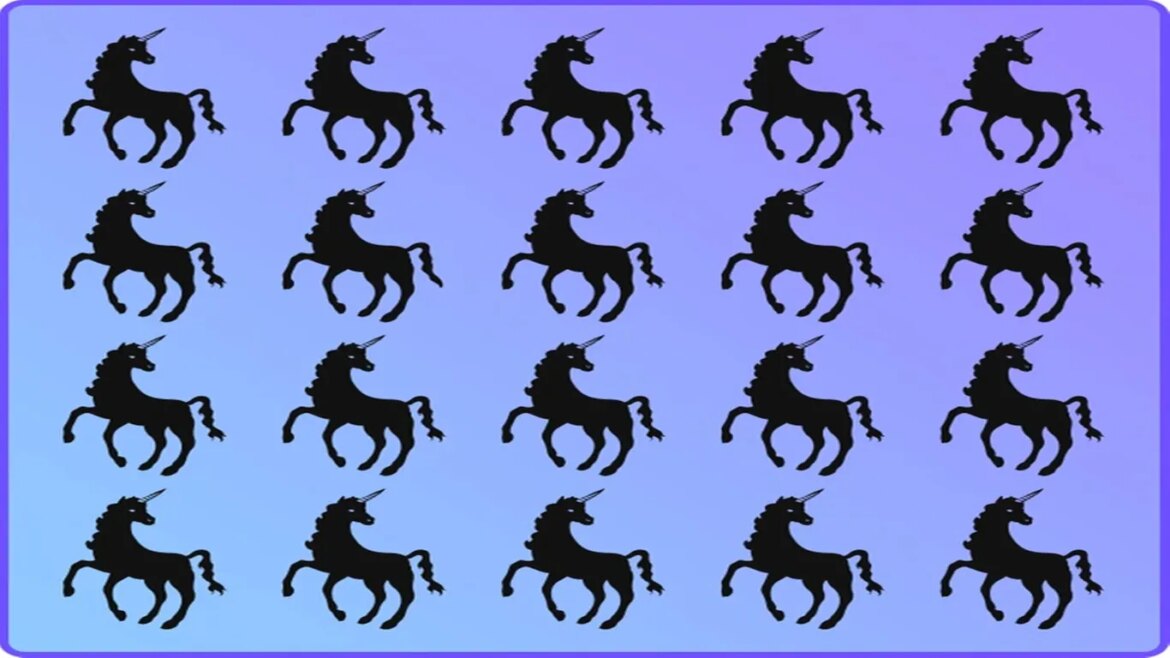 Prepare-se para o desafio de hoje que vai testar sua percepção! Observe com bastante atenção a imagem com 20 silhuetas de unicórnios pretos sobre fundo em degradê azul-lilás. Então, existe um único unicórnio diferente dos outros para você identificar. Você consegue encontrar em até 25 segundos?