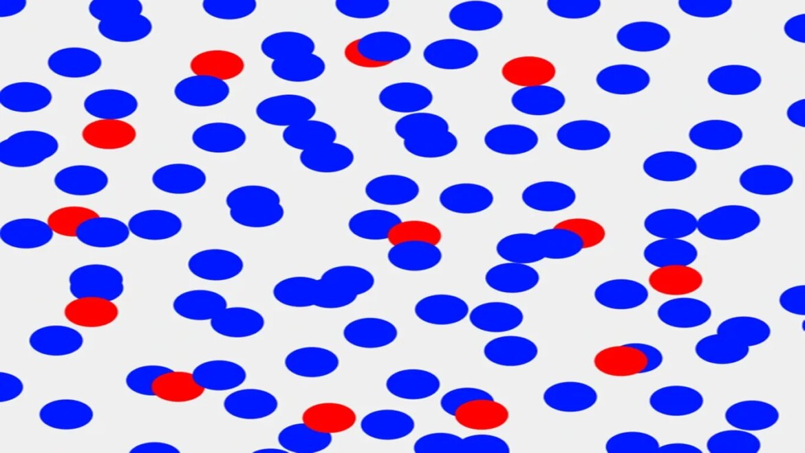 Desafio visual com fundo cinza e diversos círculos azuis e vermelhos organizados aleatoriamenteDesafio visual com fundo cinza e diversos círculos azuis e vermelhos organizados aleatoriamente