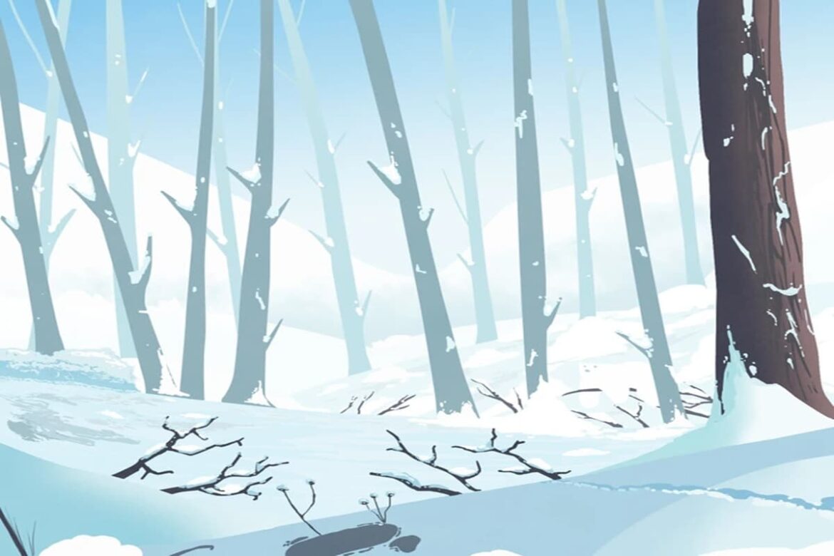 Prepare-se para o desafio de hoje que vai testar sua percepção! Observe com bastante atenção a imagem artística mostrando uma floresta no inverno, com árvores altas e finas cobertas de neve. O chão está totalmente coberto por um manto branco que envolve galhos caídos.