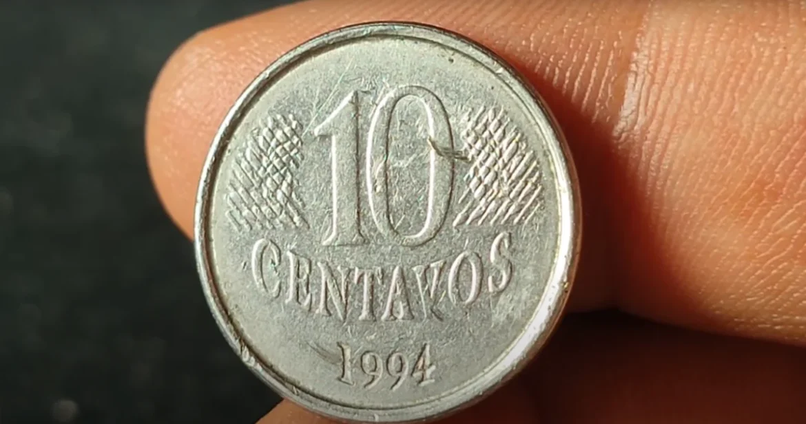 A duplicação do nome “Brasil” e do número “10” em ambos os lados caracteriza a marcação dupla. Moedas dos anos de 1994 e 1995 com esse erro podem chegar a R$ 150.