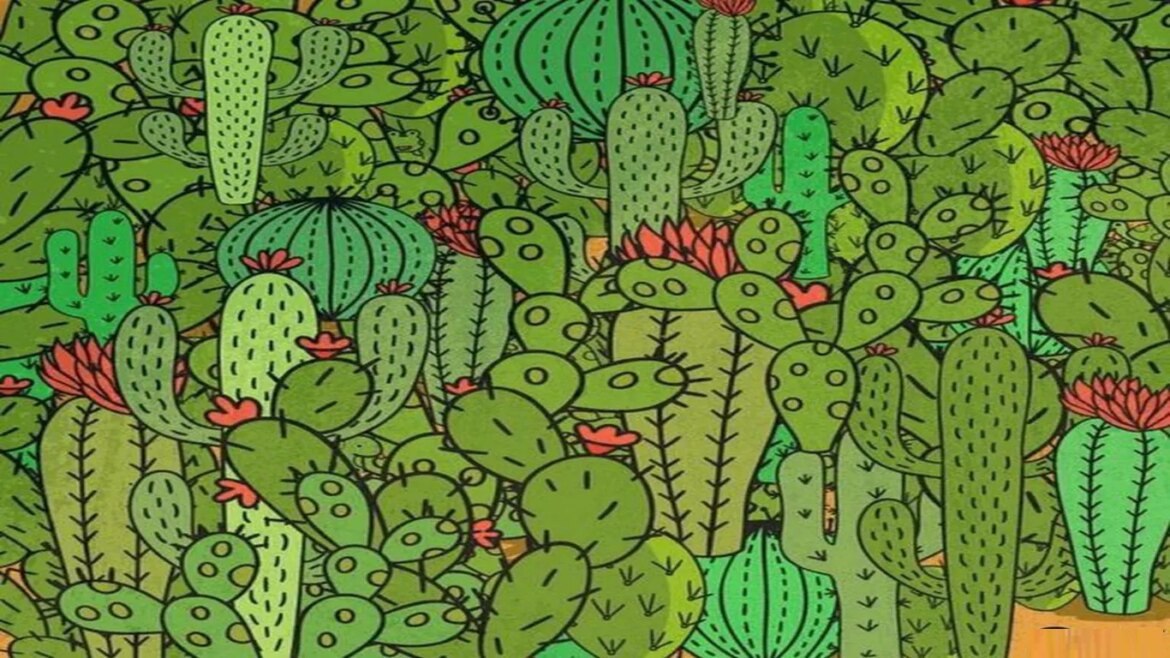 Prepare-se para um desafio que vai testar sua percepção! Observe com bastante atenção a imagem com vários cactos com formatos e tamanhos diferentes. Existe um sapo, uma cobra e uma tartaruga escondida nesta paisagem repleta de cactos. Você consegue encontrar o sapo, a cobra e a tartaruga em até 35 segundos?