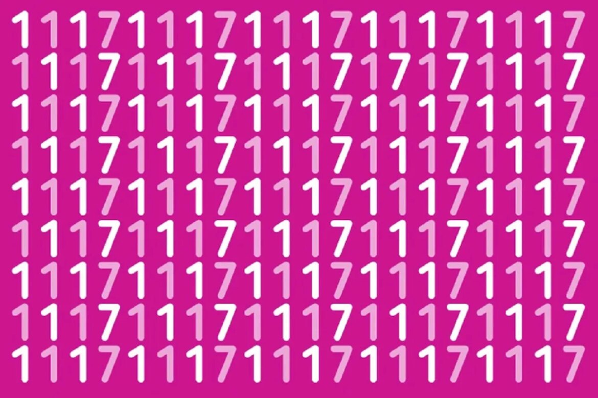 Teste visual com vários números 1 e apenas alguns números 7 misturados em fundo rosa.